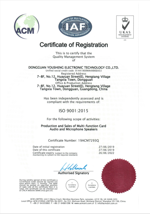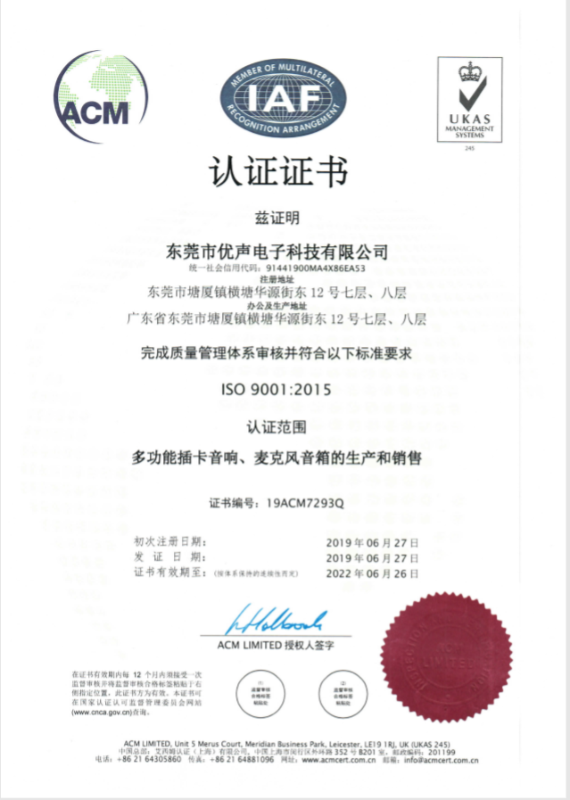 在公司員工的不懈努力下,經(jīng)過艾西姆認(rèn)證(上海)有限公司專家組的全面、嚴(yán)格、細(xì)致的指導(dǎo)和審核,專家一致確認(rèn)我司快樂相伴系列:多功能插卡音響,麥克風(fēng)音箱的開發(fā)與銷售,項(xiàng)目均符合ISO9001:2015質(zhì)量管理體系標(biāo)準(zhǔn)要求,并于2019年06月27日,向我司正式頒發(fā)ISO9001:2015質(zhì)量管理體系證書。